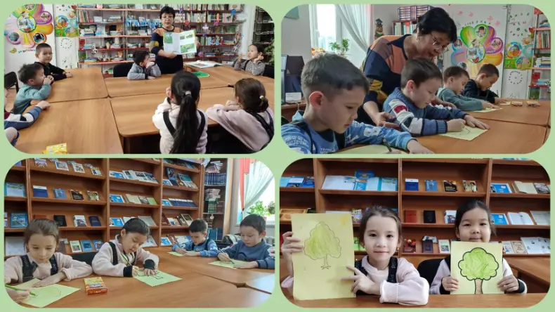 Кездесу басында кітапханашы балаларды «Қазақстан табиғаты», «Природа» энциклопедияларынан, ағаштар туралы қызықты фактілермен таныстырып, осы кітаптарды ата-аналарымен бірге оқуды ұсынды. Содан кейін үйірмеге қатысушылар шығармашылықпен айналысты, олар ағаш бейнесін салып, оны түрлі-түсті қарандаштармен бояп шықты.