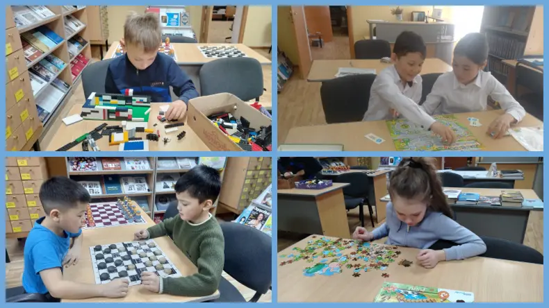 Кітапханашы балаларға үстел ойындарын ойнауды ұсынды: «Көңілді оқу» лотосы, «Шахмат», «Дойбы», «Миллионер» серуендеу ойыны. Балалар «Лего» конструкторы мен басқатырғыштарды қызығушылықпен жинады.