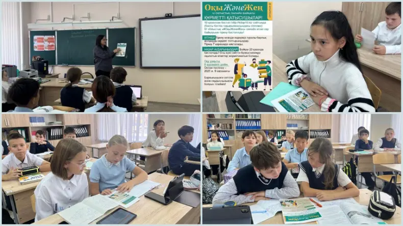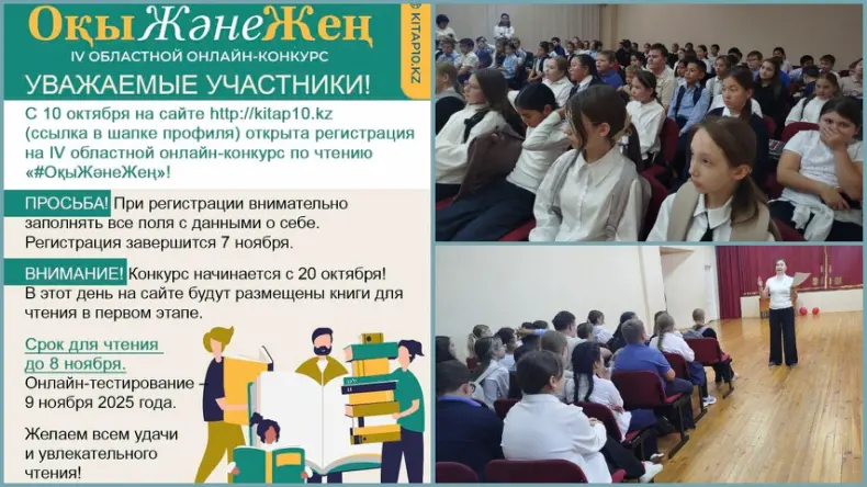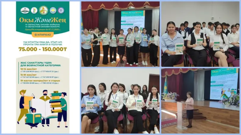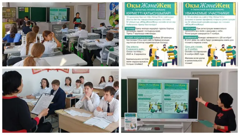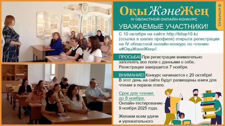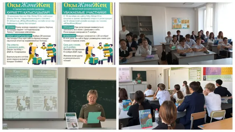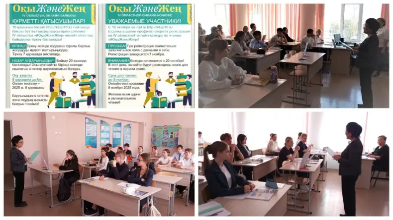 Сотрудники библиотеки-филиала «Западный» для учащихся общеобразовательной школы-гимназии № 18, 7 «Б» класса провели разъяснительную работу по пропаганде IV областного онлайн-конкурса «#ОқыЖәнеЖең», проводимый при поддержке акимата Костанайской области с целью развития культуры чтения населения. Библиотекарь ознакомил с положением конкурса, который стартует 10 октября 2025 года и заканчивается 16 января 2026 года и проводится в четыре этапа. Призвал ребят принять участие в конкурсе, зарегистрировавшись на сайте http://www.kitap10.kz/.