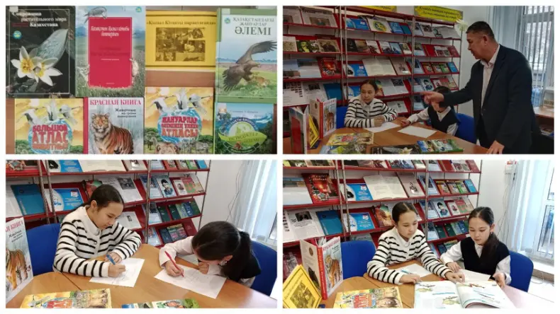 Библиотекарь рассказал, что Красная Книга – это свод различной информации о растениях и животных, которые находятся на грани своего исчезновения из-за вмешательства человека. Дети узнали о редких животных и растениях нашей страны, приняли участие в викторине «Мир природы» и отгадывали кроссворды. В завершение библиотекарь представил издания на тематической полке «Қызыл Кітапты парақтағанда».