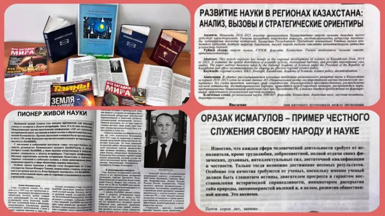 В представленных на тематической полке статьях из периодической печати рассказывается о современных учёных, которые являются двигателем прогресса и развития общественной жизни. Одним из таких учёных является Оразак Исмагулов, о котором рассказывается в журнале «Мысль» в статье «Оразак Исмагулов – пример честного служения своему народу и науке». В статье Мархабата Касенова «Пионер живой науки», вышедшей в журнале «Мысль», говорится о том, что была организована Международная научно-практическая конференция в честь 120-летия Казахского научно-исследовательского ветеринарного института.
